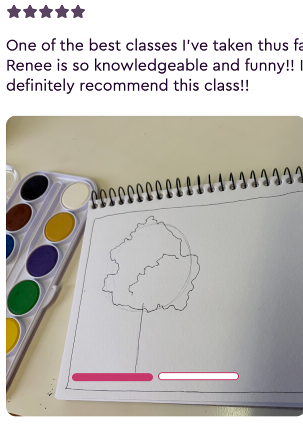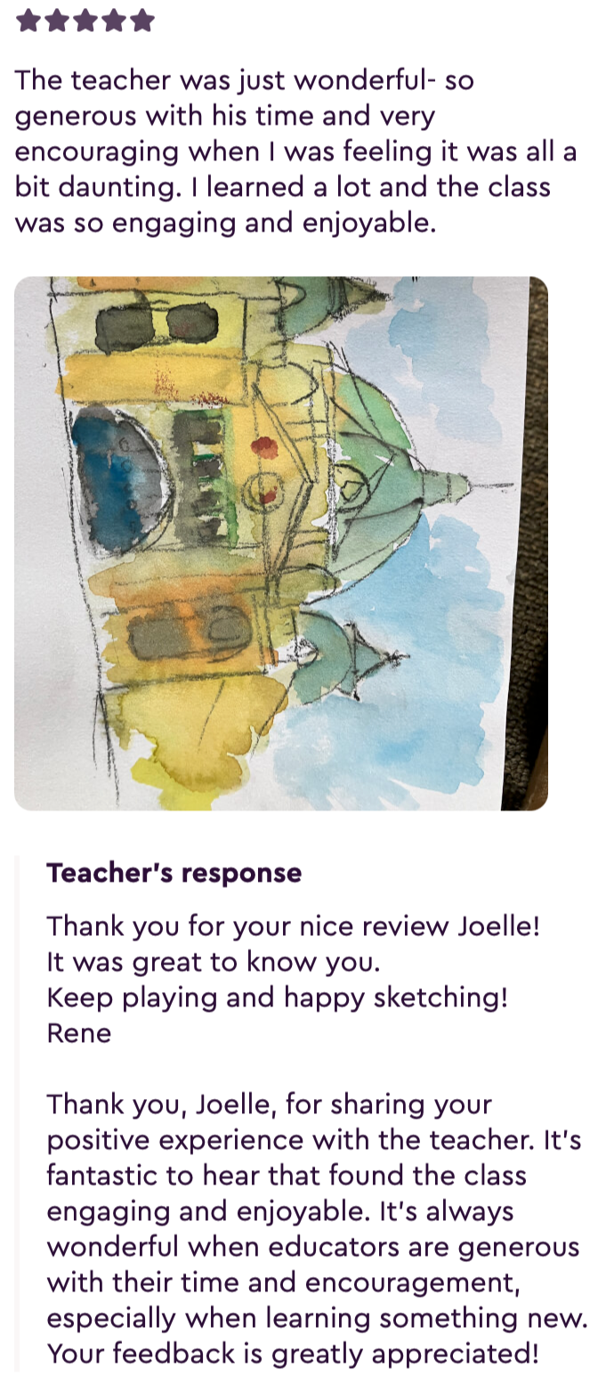 During the class, you’ll use simple materials like pens, watercolour, and paper to learn how to capture a scene or a moment.